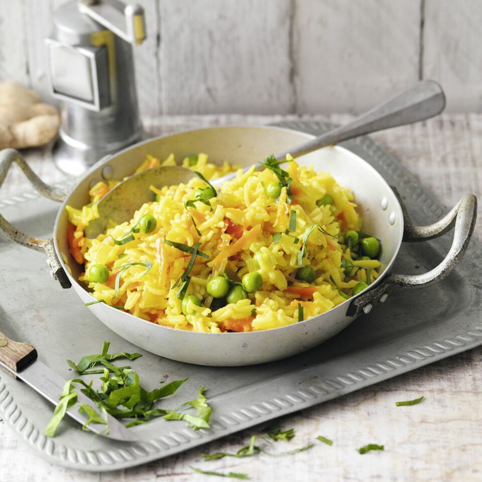 Ghee in einer Pfanne erhitzen, Zwiebel und Knoblauch anschwitzen. Ingwer und Kurkuma zugeben und 1 Min. braten. Möhren, Erbsen und Reis zufügen und weitere 5-6 Min. anbraten.
