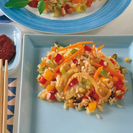 Gebratener Reis wird in ganz Asien mit den verschiedensten Zutaten zubereitet - egal ob vegetarisch, wie in diesem Rezept, mit Fisch oder Fleisch.