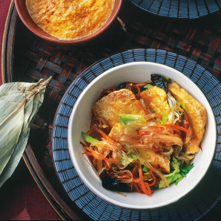 Den Tofu in ½ cm dicke Scheiben schneiden. Knoblauch schälen und fein hacken. Morcheln abgießen, gut ausdrücken und in feine Streifen schneiden. Reisnudeln abgießen, mit einer Küchenschere in 10-15 cm lange Stücke schneiden.