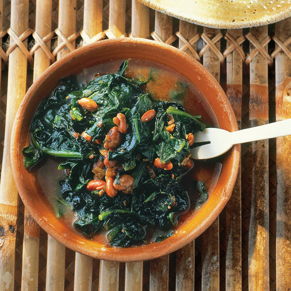 Hier ein vegetarisches Thai-Gericht, das schnell gemacht ist und sicher gelingt: Wasserspinat und Taujiau, eingelegte Bohnen aus dem Glas, bekommen Sie im Asienladen.
