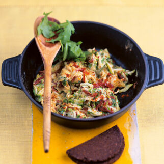 Die Frühlingszwiebeln waschen, putzen und in Längsstreifen schneiden. Die getrockneten Tomaten fein hacken. Frühlingszwiebeln, Tomaten und Basilikum unter die Marinade mischen und diese kräftig mit Salz und Pfeffer würzen.