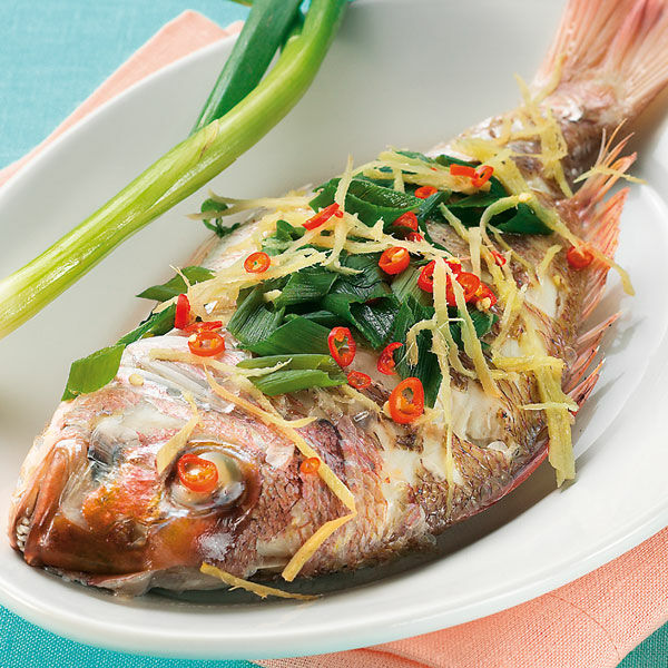 Ingwer und Knoblauch schälen, Zwiebeln und Chilis putzen und in feine Streifen schneiden. Würzgemüse auf den Brassen verteilen, mit Fischsauce und Brühe beträufeln. Im Wok über 1/2 l kochendem Salzwasser 12-15 Min. dämpfen.
