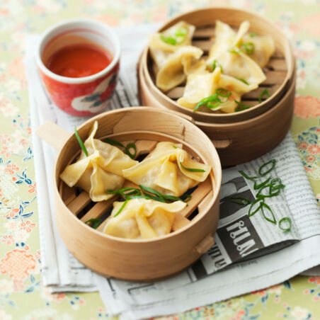 Zum Dämpfen im Topf ausreichend Wasser mit den übrigen ganzen Limettenblättern und den Resten des Zitronengrases zum Kochen bringen. Den Dämpfaufsatz mit passend rund zugeschnittenem Backpapier auslegen und die Wan-Tans darin verteilen. Den Aufsatz auf den Topf setzen (er sollte das Wasser nicht berühren) und die Wan-Tans zugedeckt ca. 10 Min. dämpfen. Mit den grünen Frühlingszwiebelstücken bestreuen und mit Chilisauce servieren.