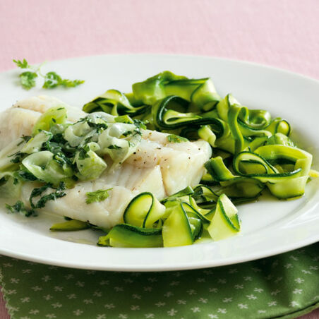 Das Fischfilet wird nur mit Limettensaft beträufelt, sanft gedämpft und behält so sein volles Aroma. Dazu gibt es "Zucchini-Nudeln" mit cremiger Sauce.