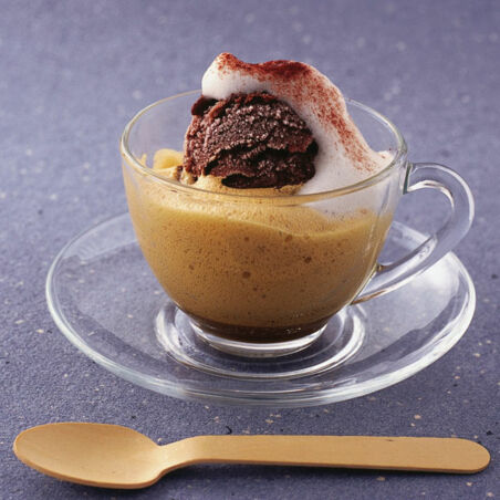 Ein perfektes Duo: Schokoladensabayon und Schokoladensorbet in einer Tasse mit geschäumter Milch serviert - mmmh!