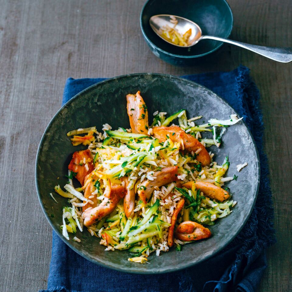 Geflügelstreifen, Reis, Kräuter sowie Apfel-, Gurken- und Sellerieraspel zur Marinade in die Schüssel geben, alle Zutaten gut miteinander mischen und vor dem Servieren 30 Min. ziehen lassen.