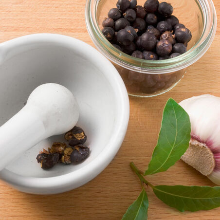 Inzwischen die Möhren und den Sellerie schälen. Den Sellerie halbieren. Den Lauch putzen, der Länge nach halbieren und gründlich ‒ auch zwischen den Blättern ‒ waschen. Die Zwiebel und den Knoblauch schälen und halbieren. Die Wacholderbeeren am besten im Mörser leicht andrücken. Die Petersilienstängel waschen.