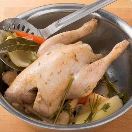 Am Ende der Garzeit das Gemüse und das Suppenhuhn aus der Brühe herausheben. Die Brühe in einen Topf passieren und gleich weiterverwenden oder kühl aufbewahren.