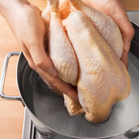 Das Suppenhuhn gründlich innen und außen waschen, dann in einen hohen Topf (20 cm Ø) mit 3 l kaltem Wasser geben und aufkochen lassen. Jetzt erst das Salz dazugeben. Offen bei kleiner Hitze 1 Std. köcheln lassen. Den dabei auftretenden Schaum abschöpfen.