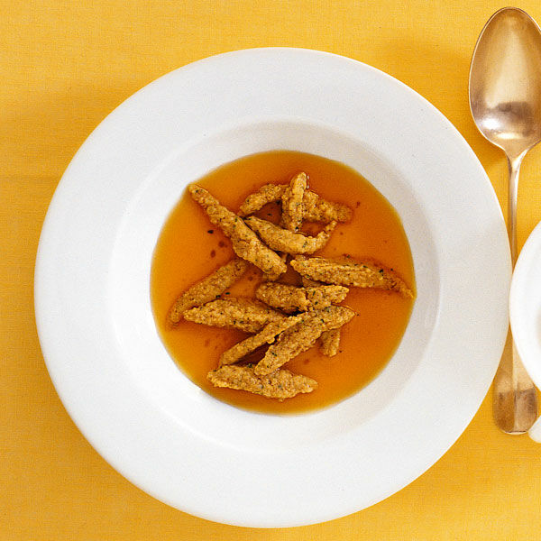 Die Brühe zum Kochen bringen. Die Masse durch den Spätzlehobel hineingeben und bei schwacher Hitze etwa 5 Min. ziehen lassen.