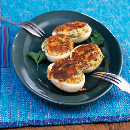 Öl in einer Pfanne erhitzen. Die Eihälften bei nicht zu starker Hitze zuerst mit der Füllung nach oben 2 Min. anbraten, dann wenden und weitere 2 Min. braten.