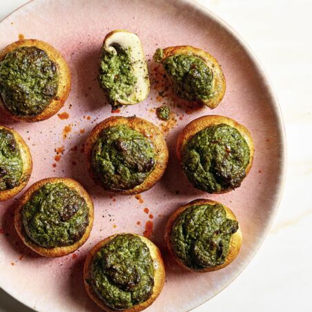 Das Olivenöl in einer Pfanne erhitzen, den Knoblauch und die Sonnenblumenkerne darin kurz anbraten. Den Spinat und die Pilzstiele dazugeben und unter Rühren erhitzen. Die Spinat-Pilz-Mischung mit dem Schafskäse in eine Schüssel geben und mit dem Pürierstab fein mixen. Die Füllung mit Salz und Pfeffer würzen und in die Pilzhüte verteilen.