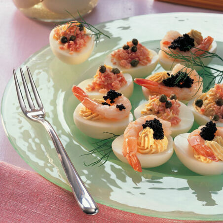 Die Garnelen kalt abspülen und mit Küchenpapier abtrocknen. Mit dem Kaviar auf 12 Eierhälften geben. Mit Dill verzieren. Den Schinken fein würfeln und mit den Kapern auf die übrigen Eierhälften geben. Die Eier attraktiv anrichten, z. B. auf einem Teller mit Tomatenscheiben.