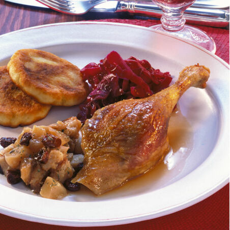 Rotkohl und Kartoffelplätzchen sind die idealen Begleiter zum festlichen Entenbraten mit süßlicher Apfel-Rosinen-Füllung.