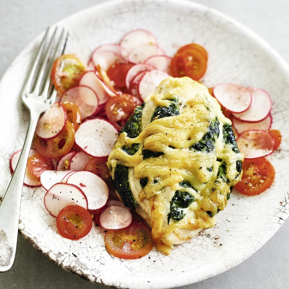 Saftiges Hähnchen kross mit Spinat und Ricotta überbacken und das Ganze auf einem knackigen Salat aus süßen Kirschtomaten und Radieschen.