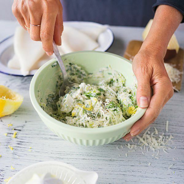 Die Zitrone heiß waschen und trocken reiben. Gut 1 TL Schale abreiben. Den Saft auspressen. Den Pecorino reiben und mit Ricotta, Olivenöl, 1 EL Zitronensaft und der Schale glatt rühren.