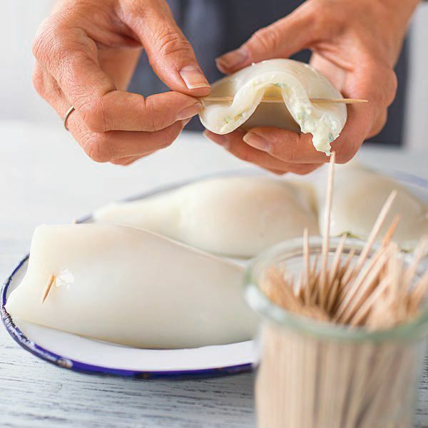 Die Tintenfischtuben kalt abspülen, trocken tupfen und innen und außen salzen und pfeffern. Ricottamasse mit einem kleinen Löffel oder einem Spritzbeutel (siehe Rezept-Tipp) hineinfüllen, die Öffnungen mit Zahnstochern verschließen. Achtung: Die Tuben sollten nur leicht, nicht prall gefüllt sein. Sie blähen sich beim Grillen leicht auf und würden dann platzen.