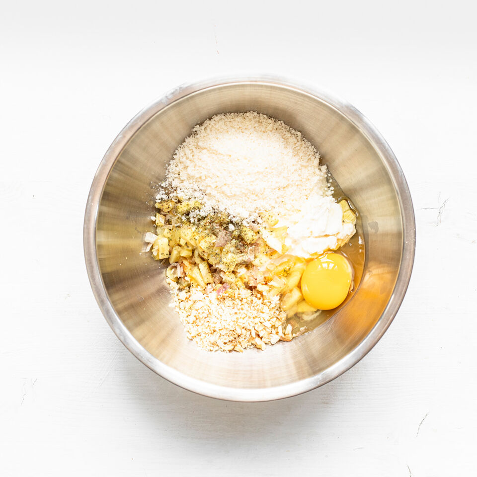 Zwiebel schälen, klein würfeln. 2 EL Öl in einer Pfanne erhitzen. Zwiebel und Zucchinifruchtfleisch darin bei mittlerer Hitze 8-10 Min. anbraten. Mit Salz und Pfeffer würzen, abkühlen lassen.