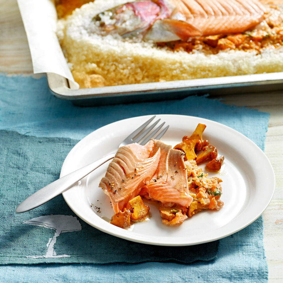 Die Lachsforelle aus dem Ofen nehmen und die Salzkruste aufklopfen oder mit einem Sägemesser aufschneiden. Den Fisch häuten und die Filets auslösen, mit der Füllung und den gebratenen Pilzen anrichten. Dazu passt knuspriges Baguette.
