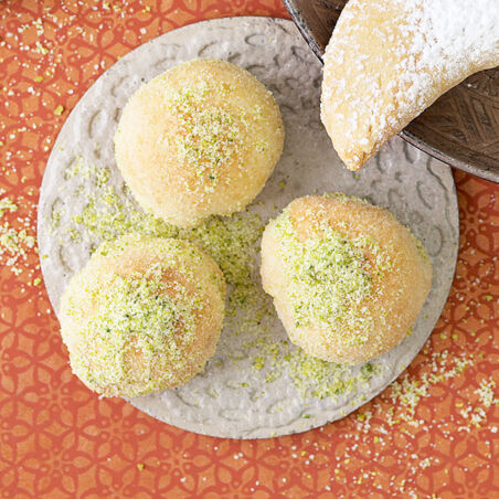 Den übrigen Zucker mit den Pistazienkernen im Blitzhacker pulverfein zerkleinern. Die gebackenen heißen Kugeln im Pistazienzucker wälzen, auf einem Kuchengitter abkühlen lassen.