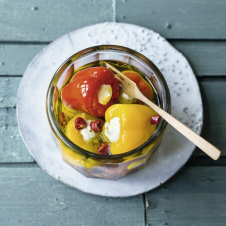 Frischkäse mit Honig, 2 EL Öl und 1 EL Essig glatt rühren, salzen und pfeffern, in einen Spritzbeutel mit Lochtülle füllen. Paprika und Chiliringe abgießen. Schoten mit Creme füllen, mit Chilis in ein Einmachglas (ca. 600 ml) füllen, mit Öl bedecken. Über Nacht durchziehen lassen.