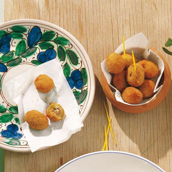 Die Oliven nacheinander in Mehl, verquirltem Ei und Semmelbröseln wälzen und im heißen Öl knusprig braun braten. Herausheben und auf Küchenpapier abtropfen lassen.