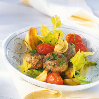 Für die Füllung Zwiebel schälen, würfeln. Die Paprika vierteln, putzen, waschen und in Streifen schneiden. Sellerie putzen, waschen und würfeln. Tomaten waschen und halbieren.
