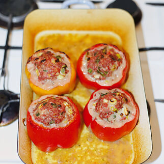 Ein wunderbar einfaches, deftiges Gericht - und es ist ganz einfach zuzubereiten Der Tomatenbulgur passt toll zu den gefüllten Paprikaschoten.