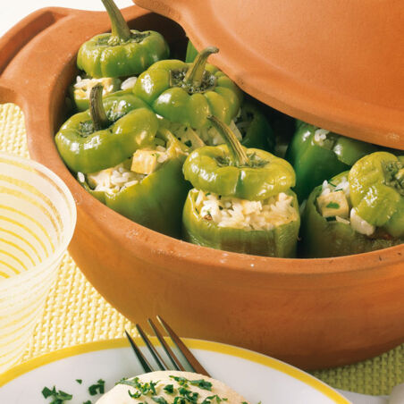 Die Paprikaschoten werden mit Reis, Tofu und Schafkäse pikant gefüllt und schmoren im Römertopf® im eigenen Saft.