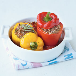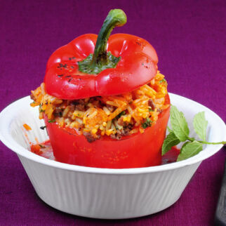 Die Paprikaschoten werden mit einer herzhaften Füllung aus Kasseler, Gouda und Quark gefüllt. Die aromatischen Rosmarinkartoffeln passen super dazu.