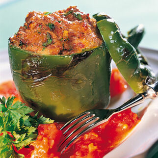 Hackfleisch mit Zitronenschale, Knoblauch, Petersilie, Tomaten, Ei, Käse und Paprikapulver verrühren, salzen, pfeffern und in die Pilze füllen. Pilze nebeneinander in die Form setzen und im Ofen (Mitte) 20 Min. backen.