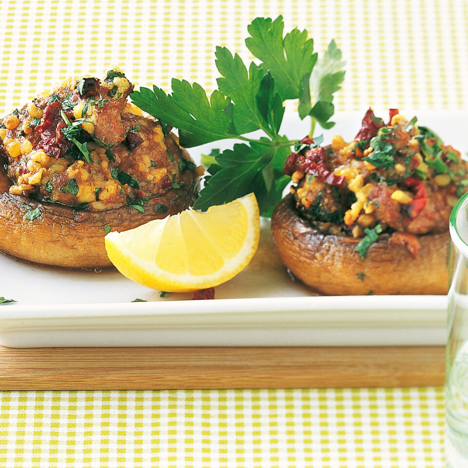 Den Backofen auf 220° (Umluft 200°) vorheizen. Zitrone waschen, abtrocknen und die Schale fein abreiben, Saft auspressen, 1 EL davon in die Pilze träufeln. Knoblauch schälen, fein hacken. Petersilie waschen, Blättchen hacken. Tomate waschen, mit den getrockneten klein schneiden.
