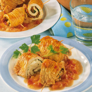 Mit einer spannenden Kombination von Spinat und Kürbis gefüllt, werden diese Putenröllchen in Tomatensauce im Ofen gegart. So können sie unmöglich zu trocken werden.