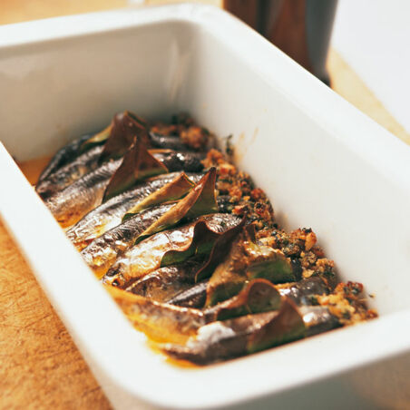 Backofen auf 220° (Umluft 200°) vorheizen. Semmelbrösel mit Ei, Rosinen samt Marsala, Pinienkernen, Knoblauchmischung, Petersilie und 2 EL Öl mischen und mit Salz, Pfeffer und 1 Prise Zimt würzen. Die Sardinen salzen, pfeffern und mit der Brotmasse füllen. Nebeneinander in eine ofenfeste Form legen, zwischen die Fische jeweils Lorbeerblätter legen.