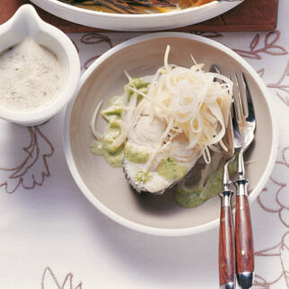 Die Wachteln aus der Pfanne heben, Fäden und Zahnstocher entfernen. Den Bratensaft durch ein Sieb in einen Topf gießen. Sahne mit Mehl verquirlen, unter den Bratensaft mischen und unter Rühren aufkochen lassen. Mit 2 EL Zitronensaft und Petersilie würzen, mit Salz und Pfeffer abschmecken. Die Wachteln in der Sauce kurz erhitzen, auf Teller legen und mit Salzkartoffeln und Salat servieren.