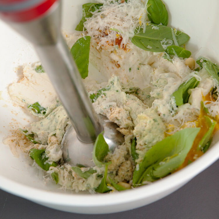 Ricotta in eine Rührschüssel geben, Basilikumblättchen grob zerzupfen und einrühren. Parmesan hinein reiben, Semmelbrösel, Pinienkerne, Eigelb, Zitronenschale und Gewürze zugeben.