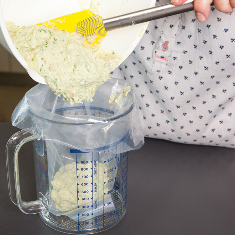 Masse kurz püriere, ggf. mit Salz und Pfeffer abschmecken und in einen Einmal-Spritzbeutel füllen.