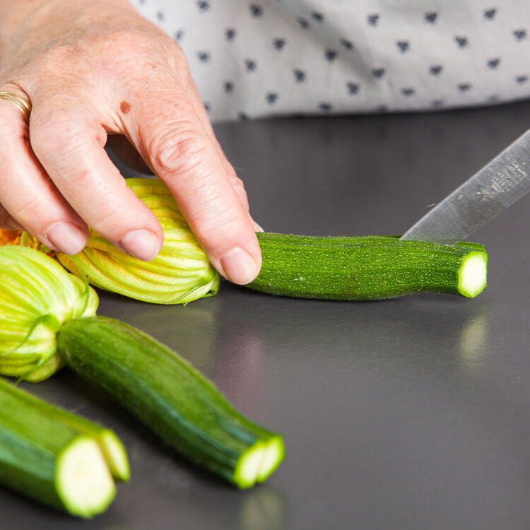 Zucchini-Stängel jeweils längs mehrmals einschneiden, dabei an der Blüte zusammen lassen. Blüte vorsichtig mit den Fingern leicht öffnen und Blütenstempel mit den Staubgefäßen abknipsen und entfernen.