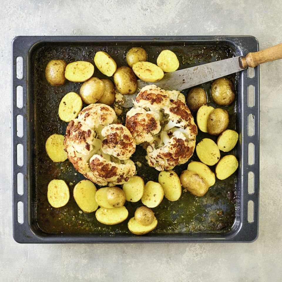 Kartoffeln waschen, halbieren, salzen und pfeffern. Mit übrigem Öl (3 EL) mischen und neben dem Blumenkohl verteilen. Folie entfernen und alles ca. 30 Min. backen. Kartoffeln zwischendurch wenden.