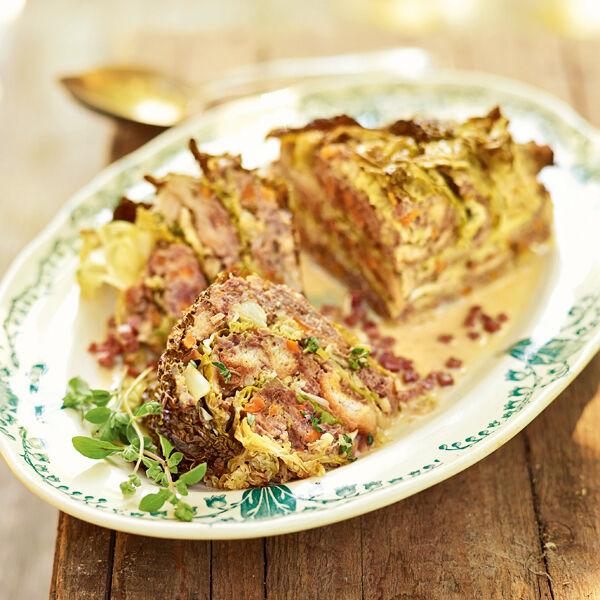 Wirsing und Hackfleisch verwandeln sich mit Gemüse, Speck und Kräutern in einen herzhaften, französischen Auflauf.