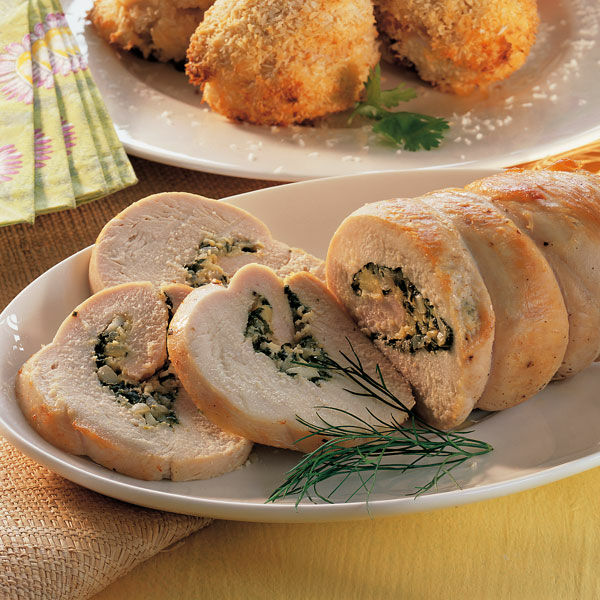 Die Mangoldmischung auf der Fleischscheibe verteilen, den Käse raspeln und aufstreuen. Das Fleisch aufrollen und mit Küchengarn zusammenbinden, dann auch außen würzen.