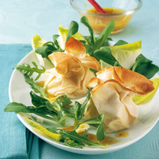 Salat und Zwiebelwürfel auf Teller verteilen und mit dem Dressing beträufeln. Den Grillkäse darauf anrichten und mit Chiliflocken bestreuen.