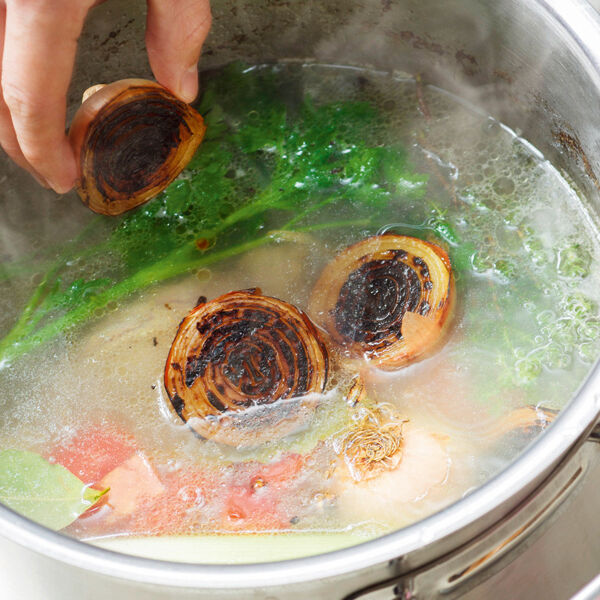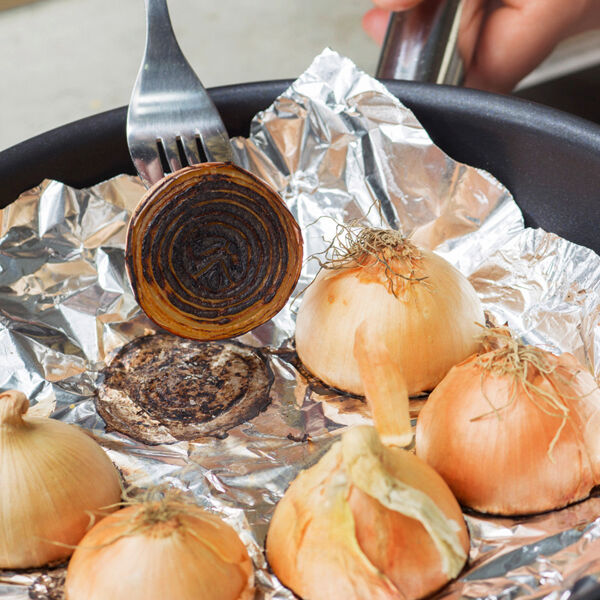 Zwiebeln waschen und ungeschält halbieren. Eine Pfanne mit einem Stück Alufolie auslegen. Die Zwiebelhälften mit den Schnittflächen nach unten in die Pfanne legen und bei starker Hitze ca. 10 Min. rösten, bis die Zwiebelunterseiten schwarz sind, herausnehmen.