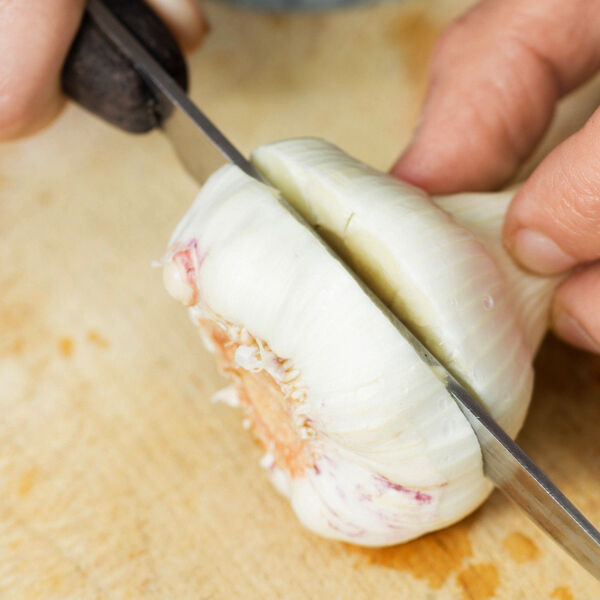 Das Suppengrün waschen und putzen oder schälen. Die Tomaten waschen und grob würfeln, dabei die Stielansätze entfernen. Knoblauchknolle waschen und ungeschält quer halbieren. Pfefferkörner mit der breiten Seite eines großen Messers oder in einem Mörser anquetschen. Die Thymianzweige abbrausen.