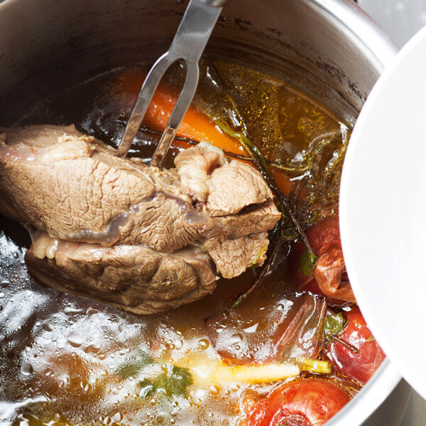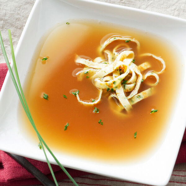 Man kann eine Rinderbrühe auch ausschließlich aus Suppenknochen kochen. Das Fleischstück macht die Brühe aber besonders gehaltvoll – und es liefert zudem noch eine eigene Mahlzeit: 500 g vorwiegend festkochende Kartoffeln schälen, waschen, ca. 2 cm groß würfeln und in 1,2 l Rinderbrühe in 12 Min. gar kochen. Das Fleisch zuerst in dünne Scheiben, dann in breite Streifen schneiden und mit in die Brühe geben, wenn die Kartoffeln fast fertig sind. Mit Schnittlauch bestreuen und servieren.