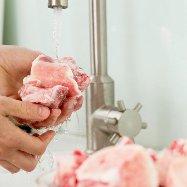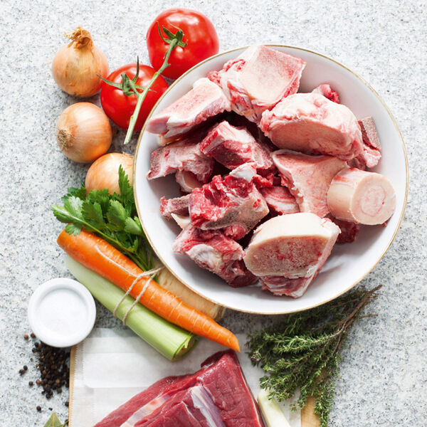 Die Rinderknochen kurz, aber gründlich waschen, um eventuelle Knochensplitter zu entfernen.