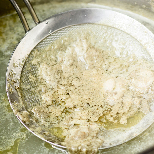 Die Brühe auf Zimmertemperatur abkühlen lassen, in den Kühlschrank stellen und vollkommen erkalten lassen. Von der kalten Brühe das erstarrte Fett abheben.