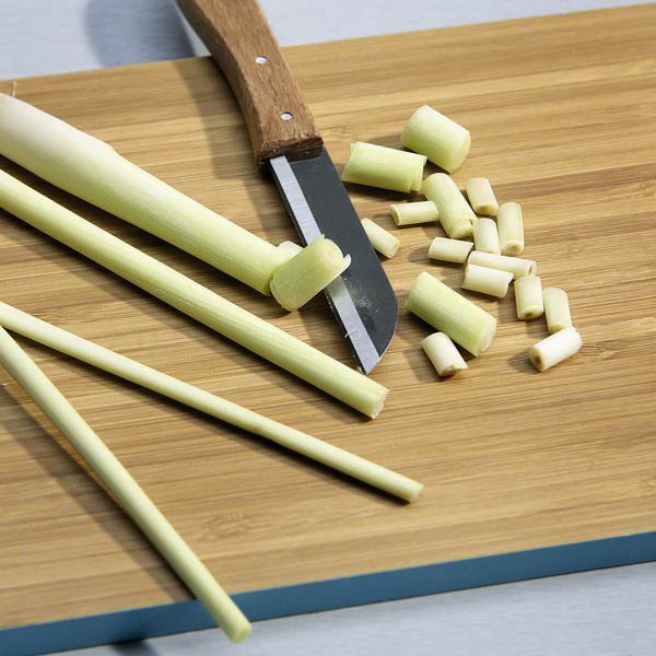 Das Zitronengras putzen, dabei den harten unteren Teil und äußere harte Blätter entfernen (Bild 1). Den weichen Kern klein schneiden (Bild 2). Galgant bzw. Ingwer, Schalotten und Knoblauch schälen und grob würfeln. Limettenblätter waschen, trocken tupfen und in Streifen schneiden.