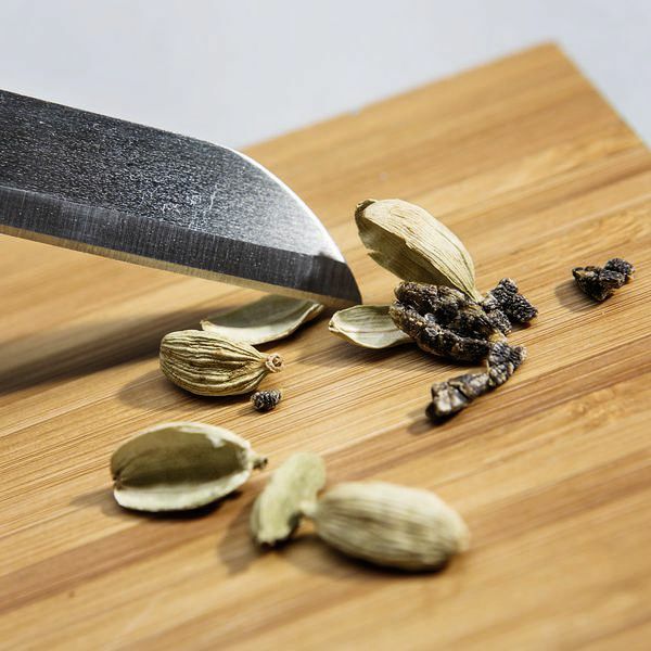 Kardamomkapseln mit einem spitzen Messer aufschlitzen und die Samen herauslösen (Bild 3). Mit Kreuzkümmel-, Koriander- und Senfsamen in einer kleinen Pfanne ohne Fett rösten, bis die Samen zu duften beginnen.