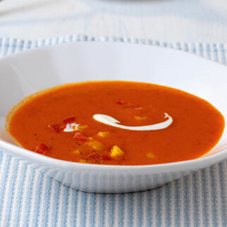 Paprika grob würfeln, mit der Kokosmilch zur Suppe geben, aufkochen und pürieren. Salzen und pfeffern. Truthahnbrust würfeln, mit den Zwiebeln unterrühren und bei schwacher Hitze 5 Min. in der Suppe erwärmen.